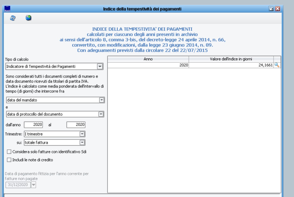 L'Indice è calcolato per ciascun anno a norma dell'art. 9 della L. 102 del 03.08.2009; sono considerati tutti i documenti completi di numero e data ricevuti dai titolari di partita iva. L'Indice è calcolato come media in giorni dell'intervallo di tempo che intercorre fra la data di registrazione del documento e la data del mandato di pagamento.