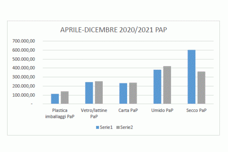 Si pubblicano i dati relativi ai quantitativi di rifiuti raccolti con sistema porta a porta nel periodo aprile-dicembre 2021 in raffronto con lo stesso periodo dell'anno 2020.