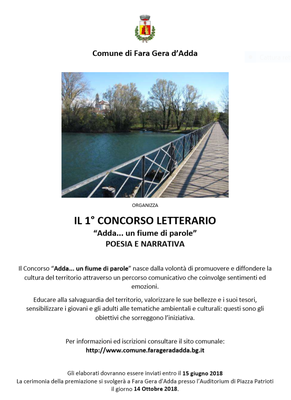 IL COMUNE DI FARA GERA D'ADDA ORGANIZZA IL PRIMO CONCORSO LETTERARIO: “Adda... un fiume di parole” - POESIA E NARRATIVA Gli elaborati dovranno pervenire entro il 15 giugno