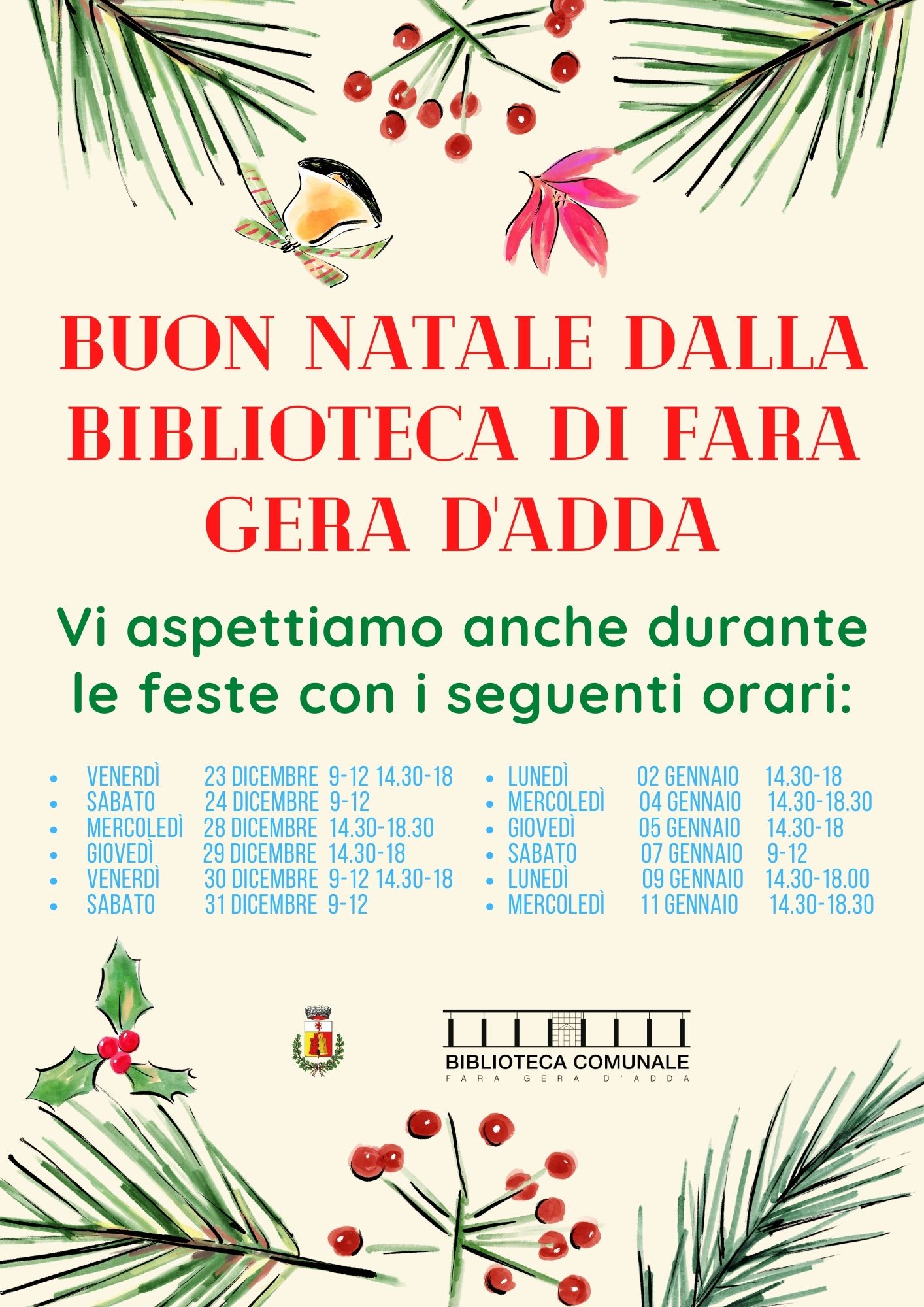 24 Dicembre 2022 Tipo articolo: Avviso Auguri dalla Biblioteca di Fara Gera d'Adda, Vi aspettiamo anche durante le festività! buon_natale_dalla_biblioteca_di_fara_gera_dadda.jpgArea tematica: Biblioteca ComunaleTempo libero, sport e cultura