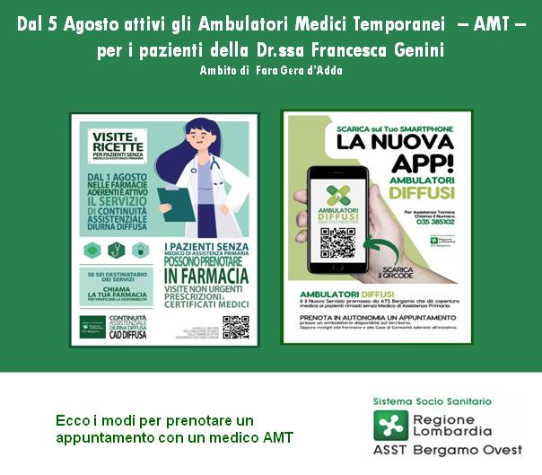 Medici AMT sono presenti, su appuntamento, anche presso la Casa di Comunità di Treviglio, sita in Via Matteotti n°4 (Ex INAM numero di telefono 0363.424563), presso la sede di Viale Piave 43b a Treviglio e presso la sede di Largo Donatori di Sangue a Caravaggio (numero di telefono 331.2341278 - 0363.50040).