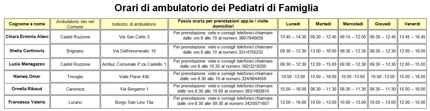 In allegato è possibile scaricare la tabella con gli orari, luoghi, modalità di prenotazione dei Pediatri disponibili.