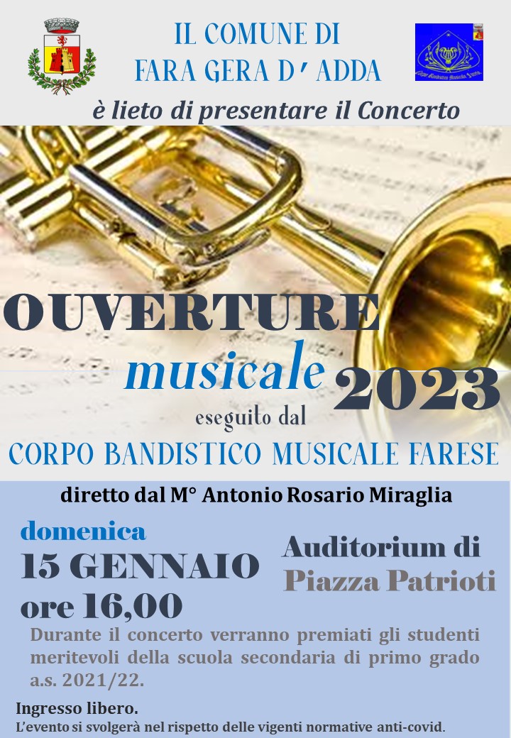 L'Amministrazione Comunale è lieta di invitare la cittadinanza al Concerto "OUVERTURE MUSICALE 2023" eseguito dal CORPO BANDISTICO MUSICALE FARESE diretto dal Maestro Antonio Rosario Miraglia.