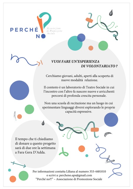 19 Dicembre 2023 Tipo articolo: Avviso PROGETTO DI TEATRO SOCIALE ogni martedì dalle 18,30 alle 20,15 presso il Centro Polivalente Falcone e Borsellino Via Canonica 2 info: 3534481010 - percheno.aps@gmail.com CLICCA QUI e QUI per vedere le locandine del progetto