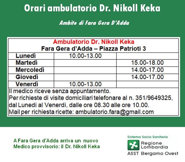 Si informa che Giovedì 12 Settembre 2024 verrà conferito al Dr. Nikoll Keka l’incarico di Medico di Assistenza Primaria provvisorio nell’ambito di Fara Gera D’Adda.