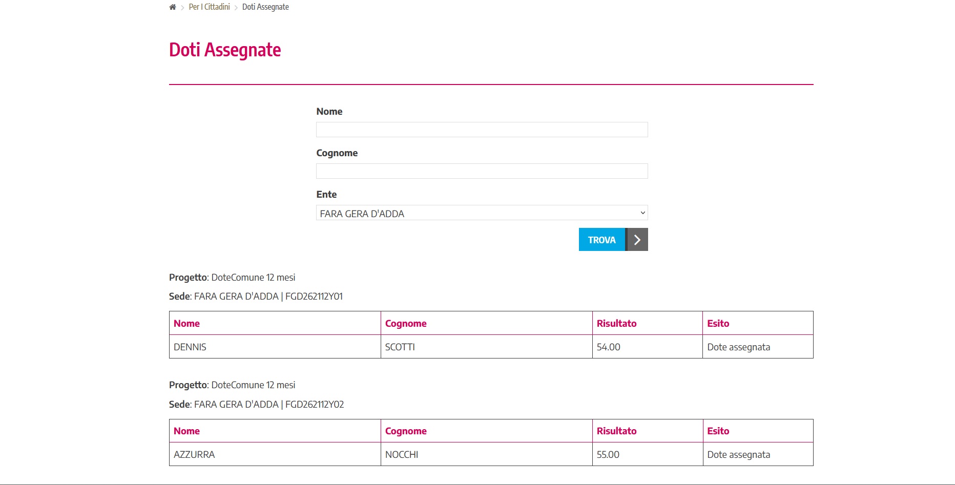 in allegato l'esito della selezione, inoltre i nomi dei vincitori sono pubblicati al seguente indirizzo: https://www.dotecomune.it/doti-assegnate/
