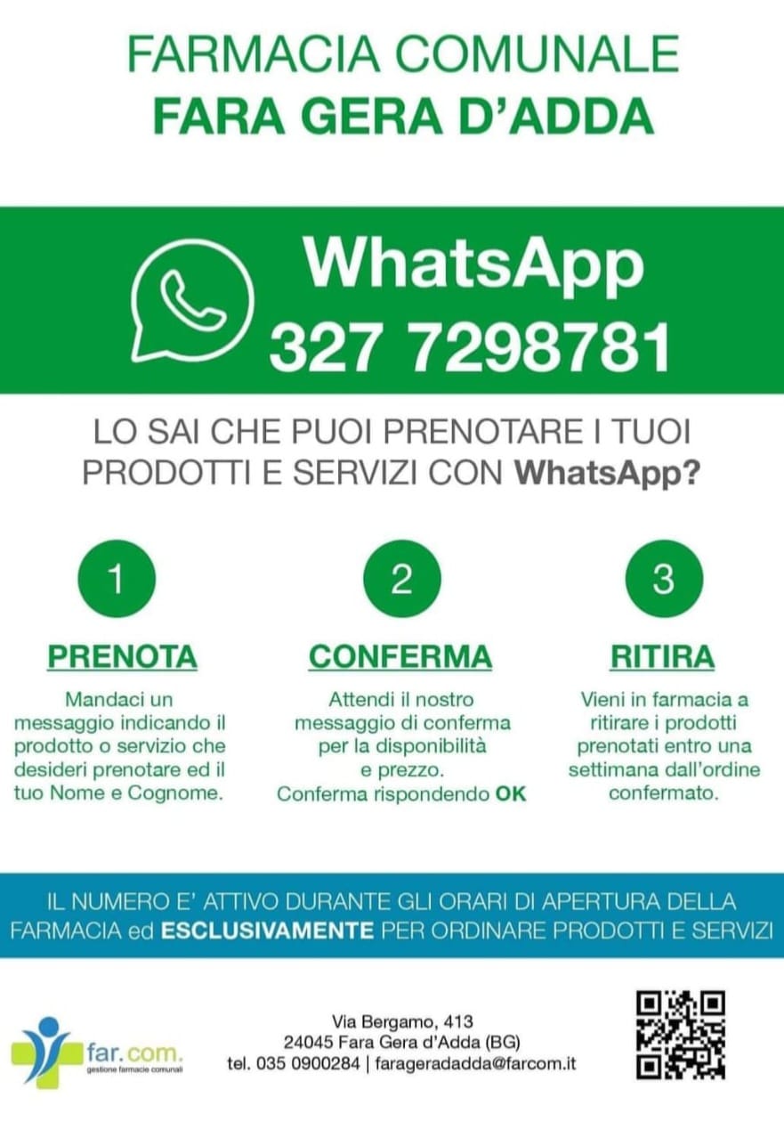 Si avvisa la cittadinanza che è anche possibile prenotare i prodotti e i servizi farmaceutici direttamente con WhatsApp.
