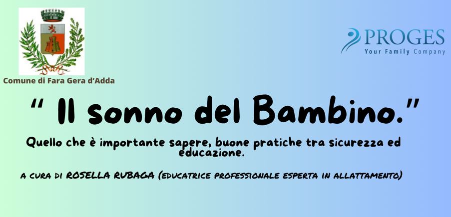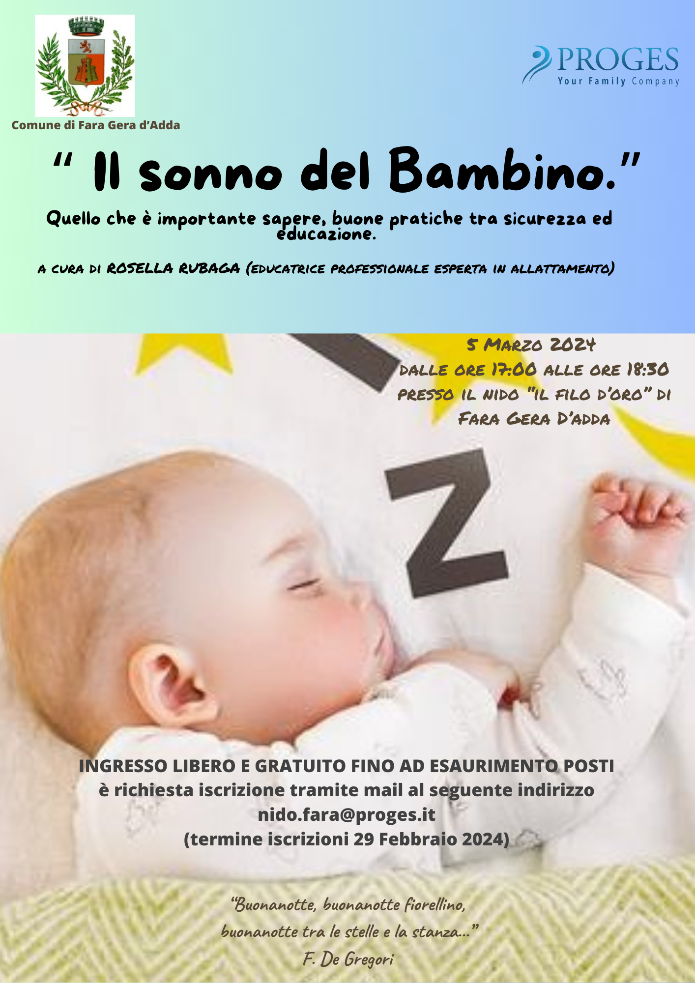 Si comunica alla cittadinanza che il giorno 5 marzo 2024, dalle ore 17:00 alle ore 18:30, presso l'Asilo Nido Comunale "Il filo d'oro", si terrà un incontro dal titolo "Il sonno del Bambino", a cura dell'Educatrice Professionale Rosella Rubaga.