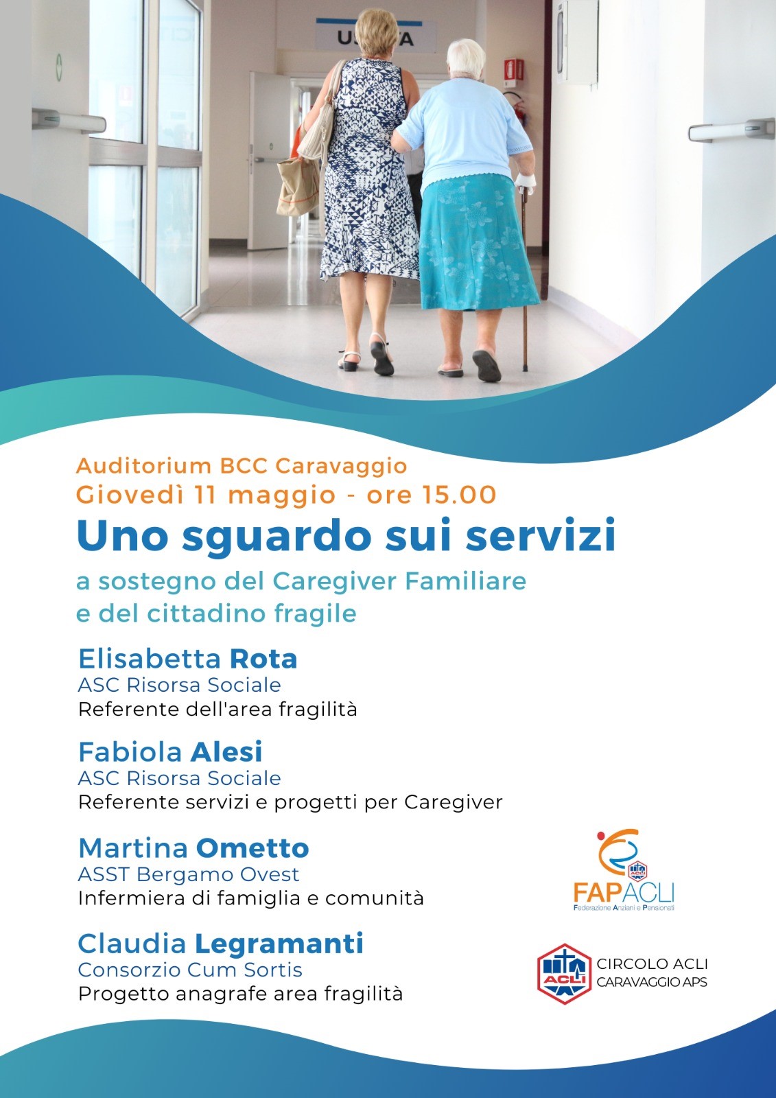 Si avvisa la cittadinanza che l'11 maggio alle ore 15:00 presso l'Auditorium BCC di Caravaggio si terrà l'incontro "Uno sguardo sui servizi - a sostegno del caregiver familiare e del cittadino fragile."