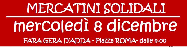 30 Novembre 2021 Tipo articolo: Avviso Le Associazioni di volontariato di Fara Gera d'Adda organizzano MERCATINI SOLIDALI mercoledì 8 dicembre 2021 dalle ore 09,00 Piazza Roma LOCANDINA EVENTOArea tematica: Tempo libero, sport e cultura