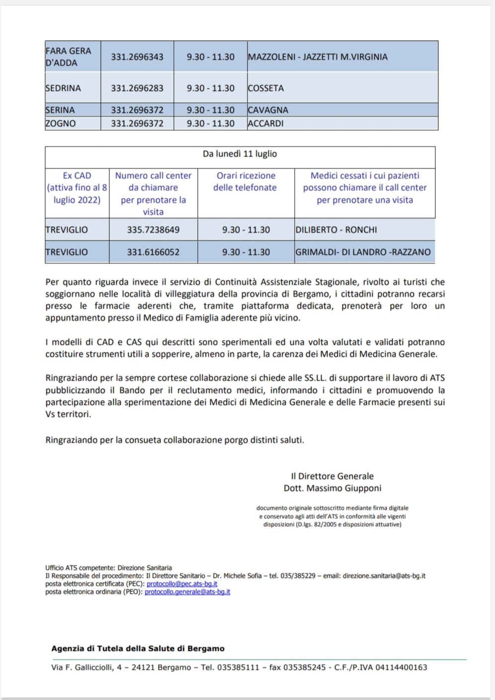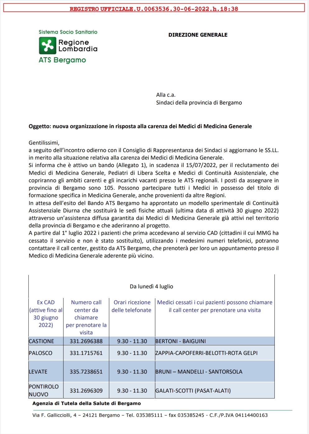 Il Sindaco informa i cittadini che dal 1 luglio 2022 non è più attiva la CAD per i pazienti sprovvisti del medico di medicina generale.