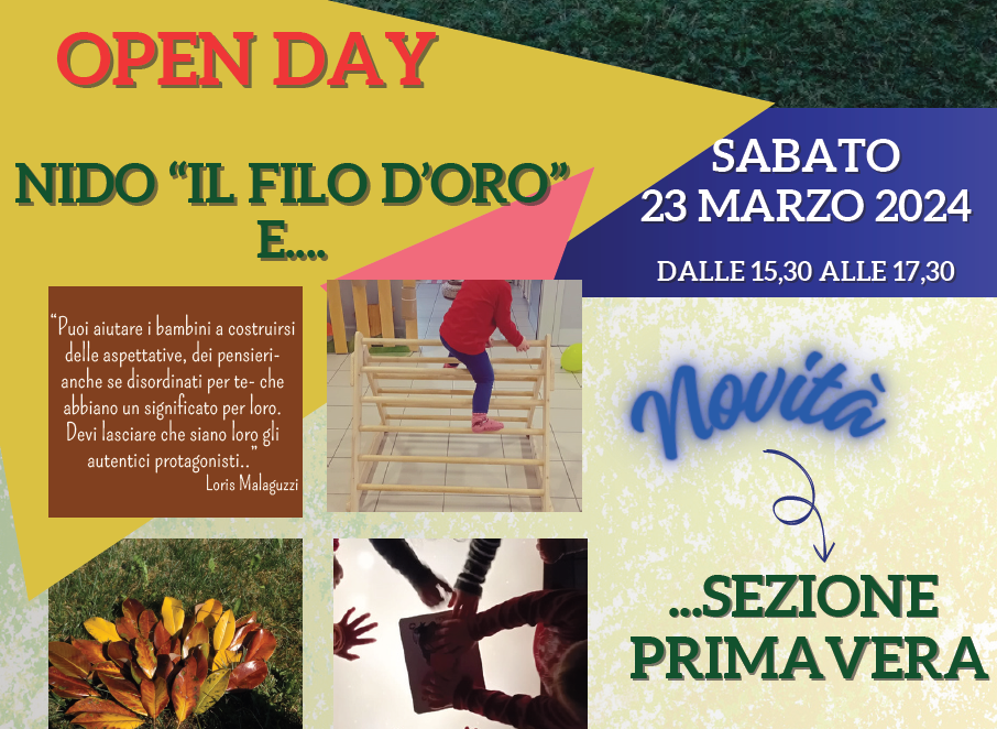 Si comunica alla cittadinanza che sabato 23 marzo 2024 dalle ore 15:30 alle ore 17:30 presso l'asilo nido di via Ponti, 13 si terrà l'open day del nido comunale "Il filo d'oro" e verrà presentata la Sezione Primavera.