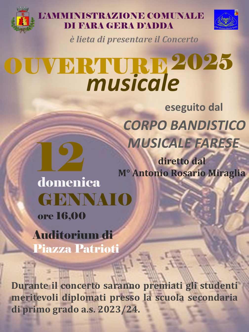 L'Amministrazione Comunale è lieta di presentare il concerto Ouverture musicale 2025, eseguito dal Corpo Bandistico Musicale farese, che avrà luogo domenica 12 gennaio alle ore 16.00 presso l'Auditorium di Piazza Patrioti.
