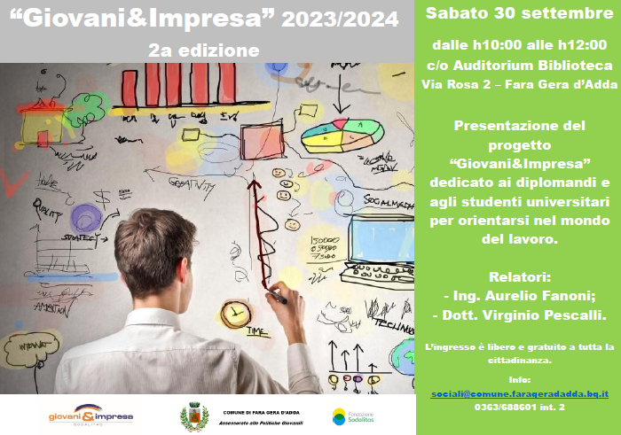 Si comunica alla cittadinanza che sabato 30 settembre dalle ore 10 alle 12, presso l'Auditorium della Biblioteca Comunale di via Rosa 2, si terrà la presentazione della seconda edizione di "Giovani&Impresa". Un progetto dedicato ai diplomandi e agli studenti universitari per orientarsi nel mondo del lavoro. Interverranno l'Ing. Aurelio Fanoni e il Dott. Virginio Pescalli.