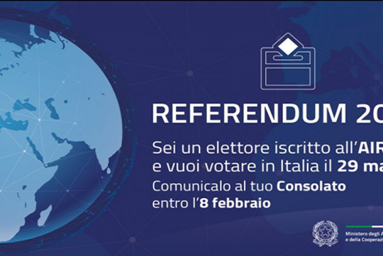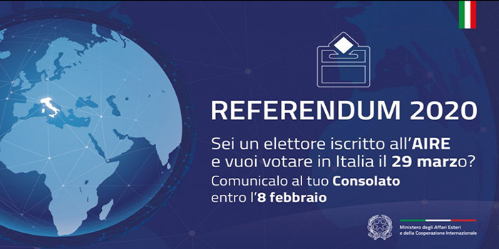 Per il Referendum costituzionale del 29 marzo 2020, gli elettori italiani residenti all'estero, ai sensi della legge 27 dicembre 2001, n. 459 e del relativo regolamento di attuazione approvato con D.P.R. 2 aprile 2003,n. 104, votano per corrispondenza.