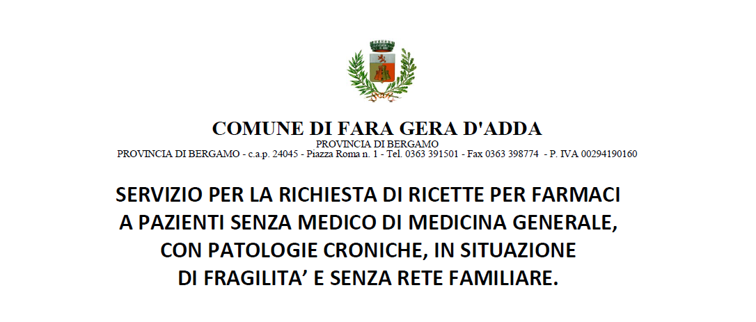 Dal 1° agosto 2023, il Comune di Fara Gera d’Adda in collaborazione con il gruppo comunale di Croce Rossa, organizza il servizio gratuito di consegna/ritiro di ricette mediche per cittadini senza medico di medicina generale, in situazione di fragilità e senza rete familiare.