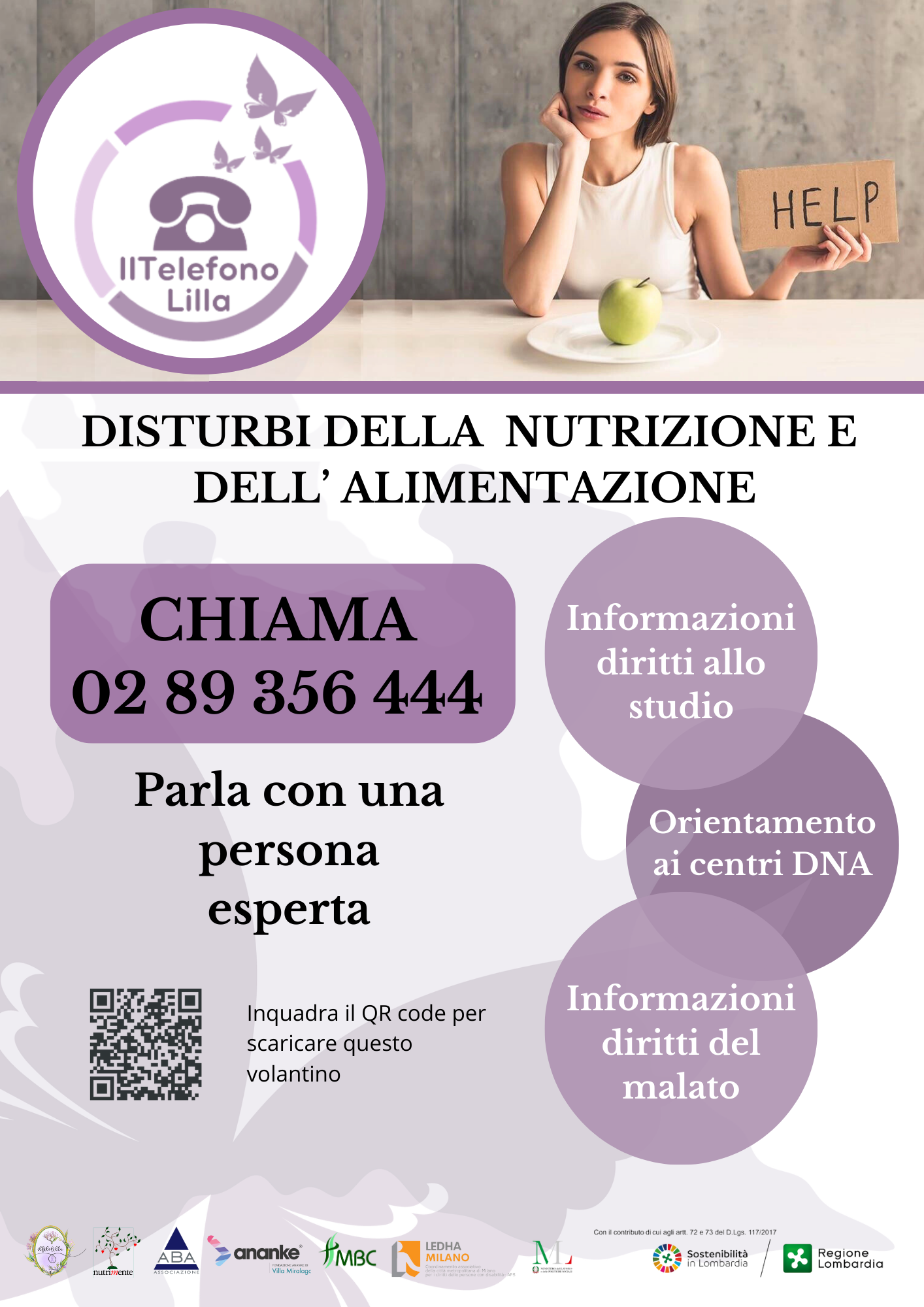 Si comunica alla cittadinanza che è attivo il Numero Verde 0289356444 de "Il Telefono Lilla". Il numero è attivo sul territorio di regione Lombardia, ed è rivolto a tutti coloro che hanno necessità di ottenere supporto, chiarimenti, aiuto poiché direttamente o indirettamente coinvolti da un Disturbo della Nutrizione e dell’Alimentazione.