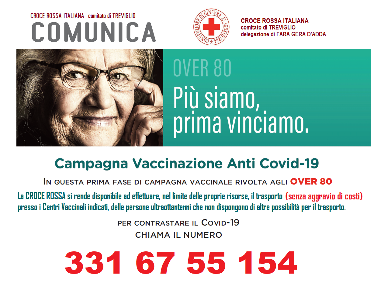 La CROCE ROSSA ITALIANA - delegazione di FARA GERA D'ADDA, SI RENDE DISPONBILE AD EFFETTUARE, NEL LIMITE DELLE PROPRIE RISORSE E SENZA AGGRAVIO DI COSTI, IL TRASPORTO, PRESSO I CENTRI VACCINALI INDICATI, DELLE PERSONE ULTRAOTTANTENNI CHE NON DISPONGONO DI ALTRE DISPONIBILITA' PER IL TRASPORTO.