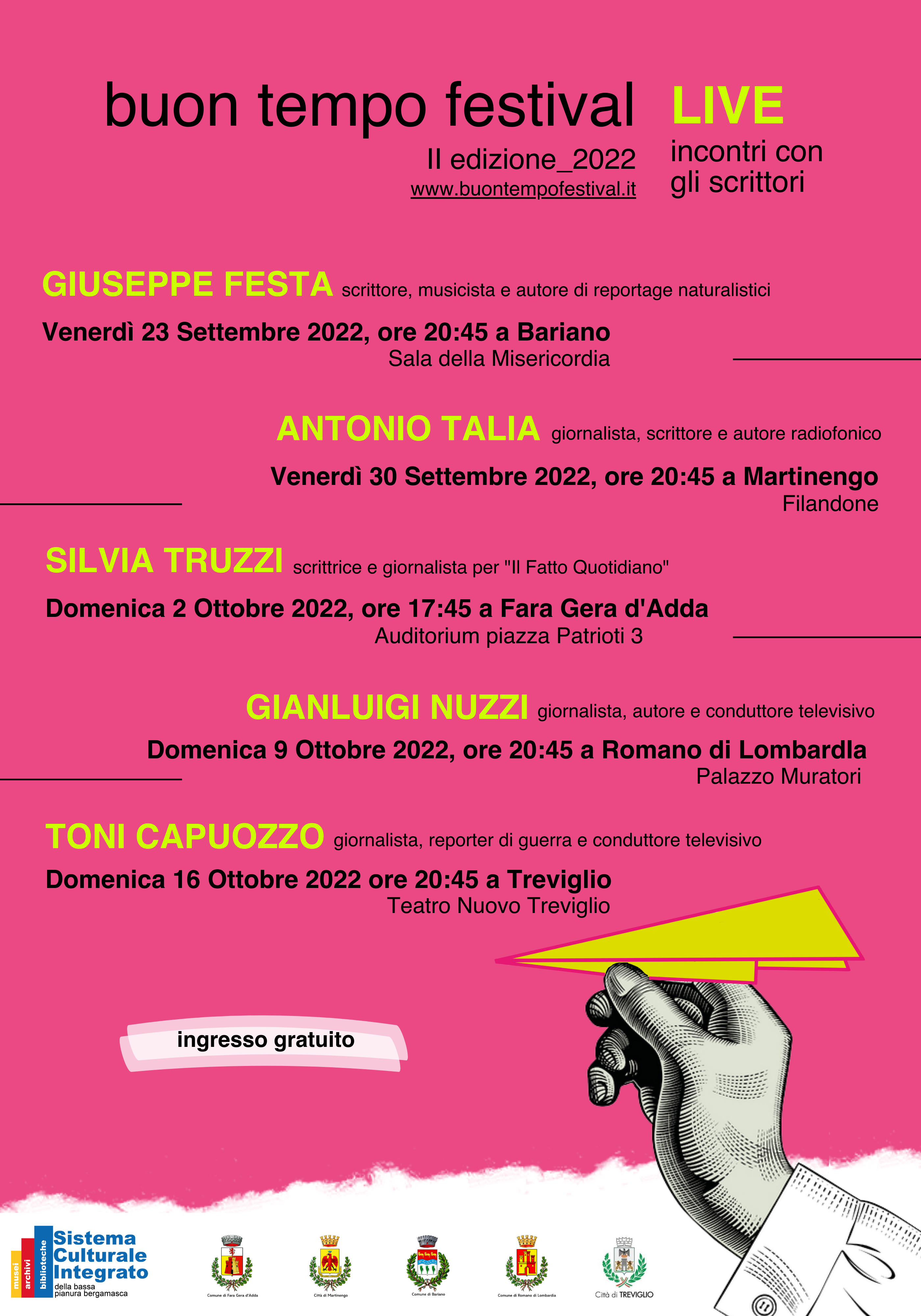 Il Festival di lettura e dintorni "buon tempo, libri per piacere" è una rassegna organizzata dal Sistema bibliotecario della bassa pianura bergamasca che vuole accompagnarvi in un mondo fatto di storie, racconti, letture, visite guidate, incontri con gli scrittori.