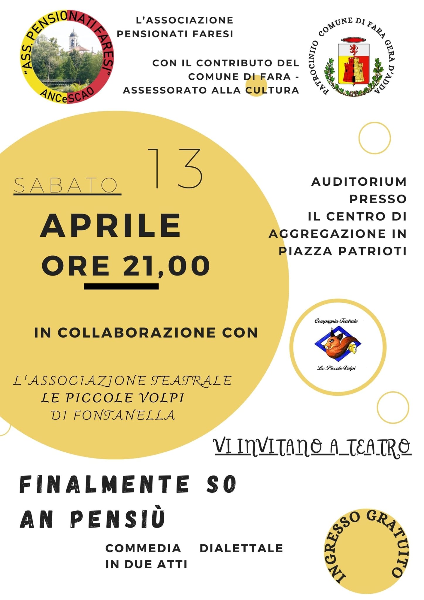 L'associazione Pensionati Faresi e l'Assessorato alla Cultura del Comune di Fara Gera d'Adda presentano lo spettacolo teatrale "Finalmente so an pensiù".