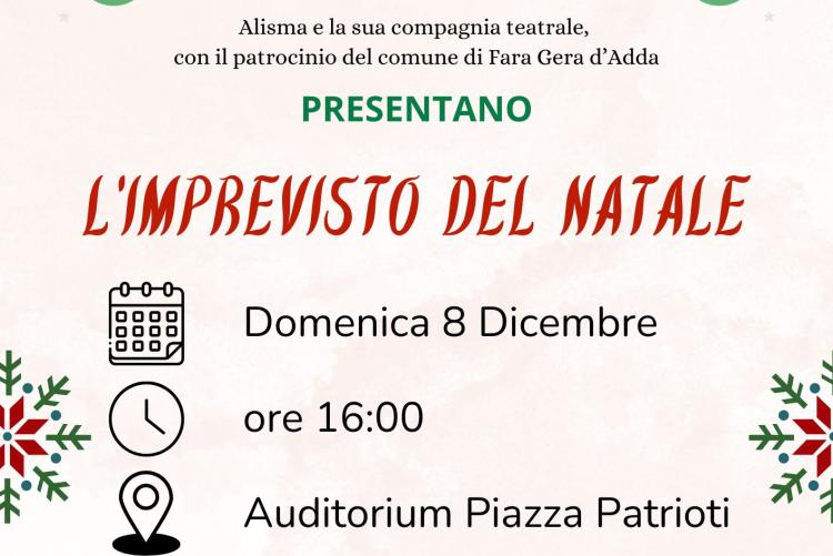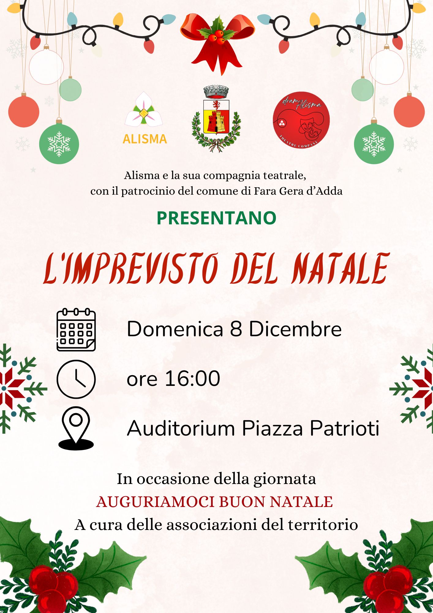 In occasione della giornata "Auguriamoci Buon Natale", Alisma e la sua compagnia teatrale, con il patrocinio del comune di Fara Gera d'Adda, presentano "L'imprevisto del Natale".