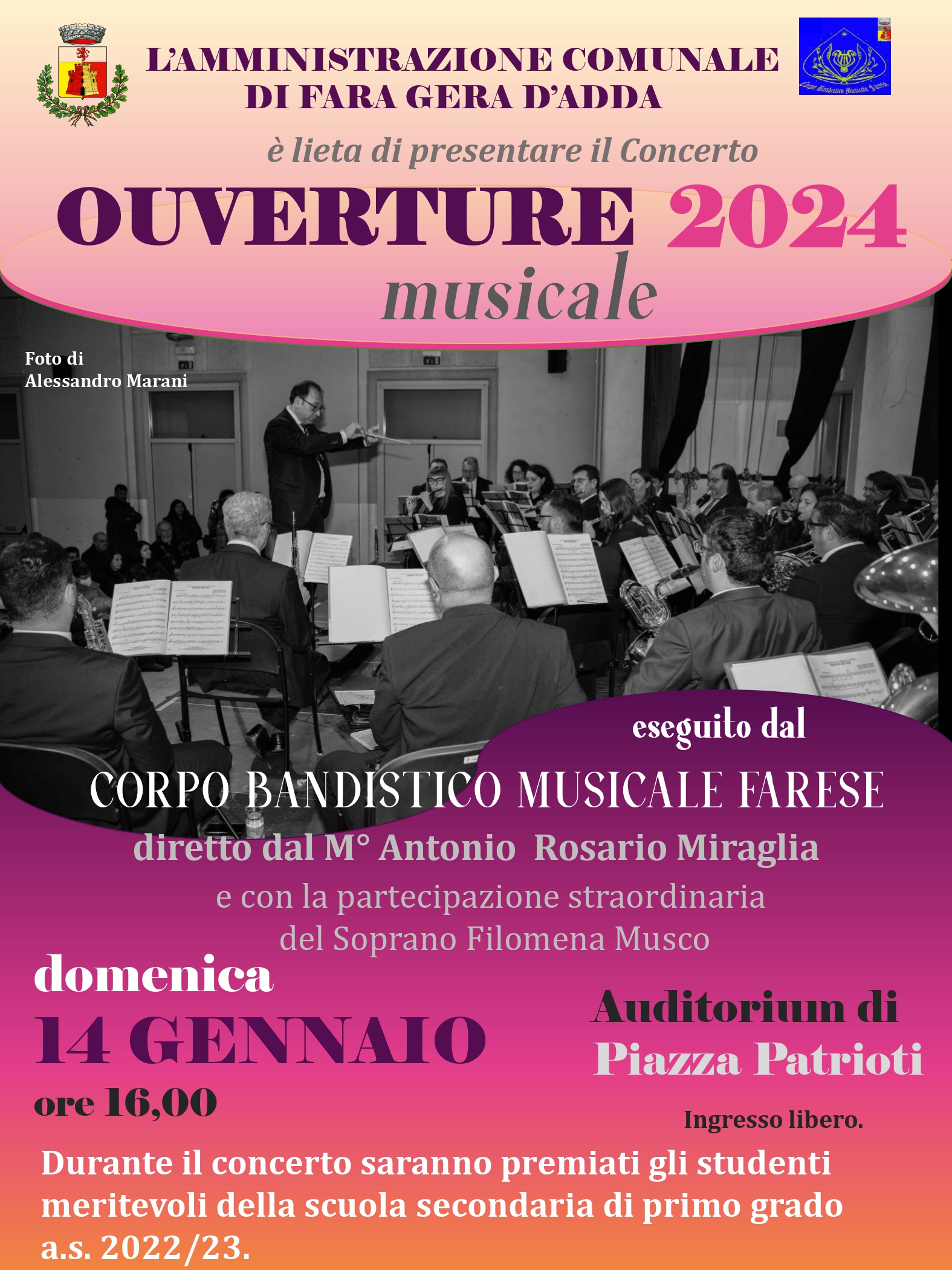 Concerto musicale eseguito dal Corpo bandistico musicale farese diretto dal Maestro Antonio Rosario Miraglia e con la partecipazione straordinaria del Soprano Filomena Musco.