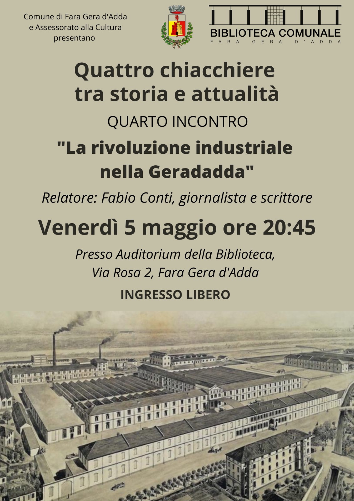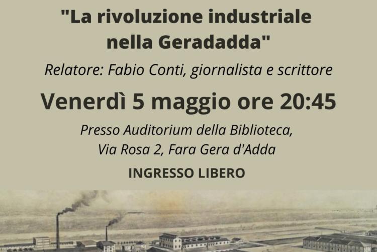 Il giornalista e scrittore Fabio Conti sarà il relatore e questa serata verterà su "La rivoluzione industriale nella Geradadda".